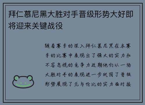 拜仁慕尼黑大胜对手晋级形势大好即将迎来关键战役